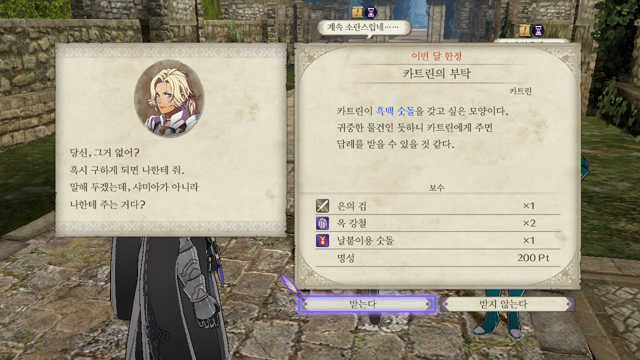 으윽... 엄청 고민하다가 카트린한테 줌 다음 회차에는 샤미아한테 줘야지... 둘다 넘 잘생겼어...